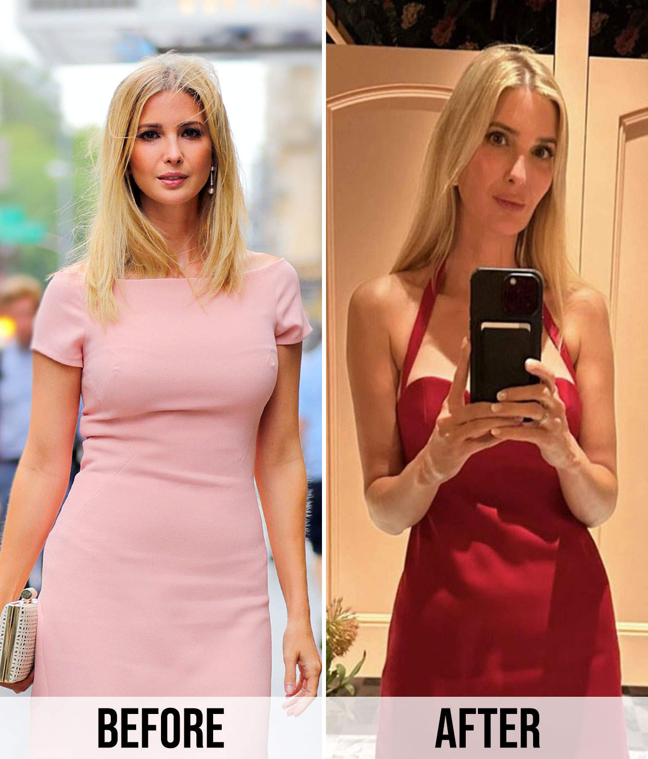 Back in 2016, Ivanka wore this soft pink midi dress in NYC. However, in 2023, Ivanka wore this provocative red dress when she was celebrating her and Jared's 14th wedding anniversary (albeit without her husband as he was in Saudi Arabia at the time) in Miami. What a way to make him kick himself for not attending!