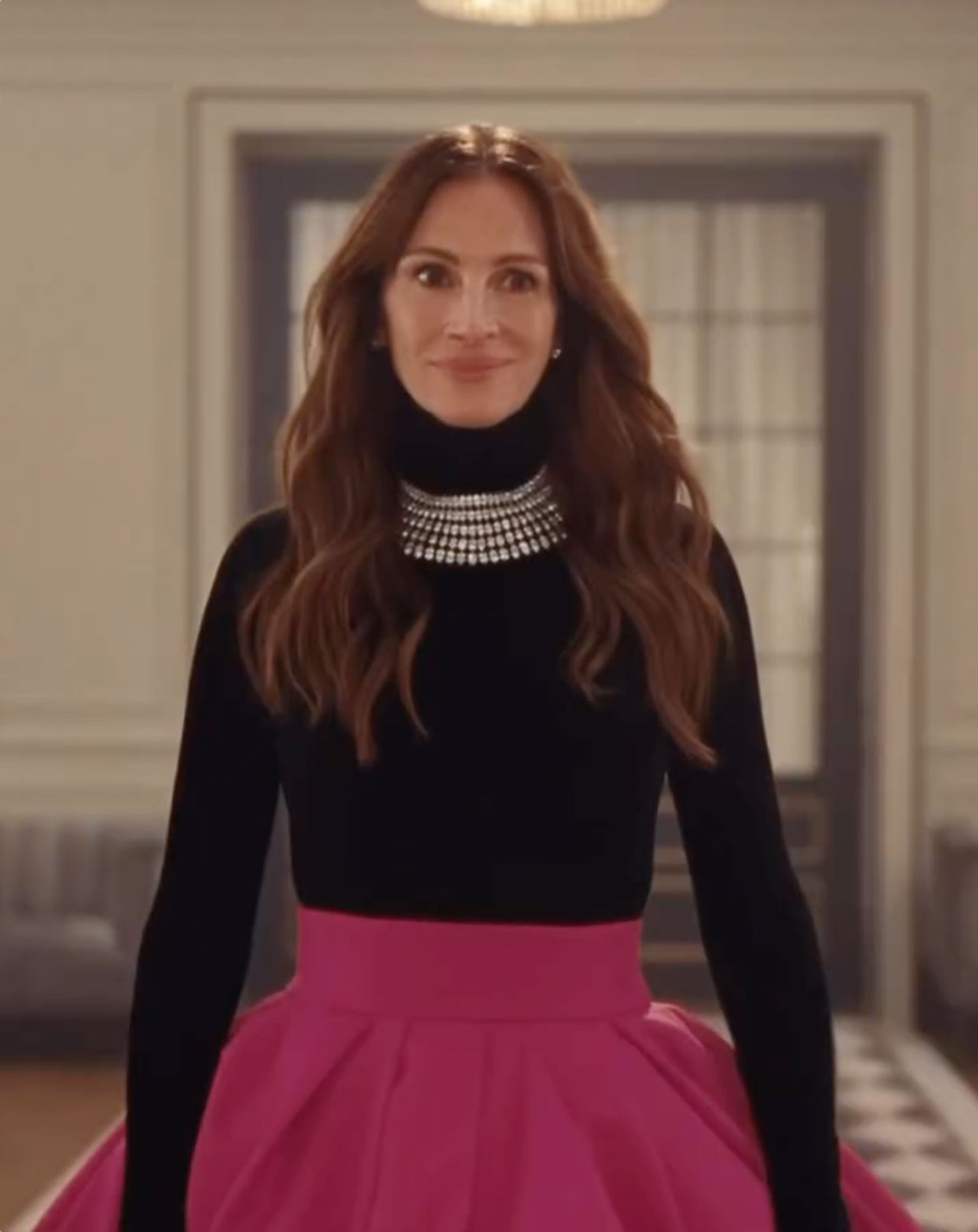 The Academy Award winner and style icon, 56, rocked a sleek, long-sleeved black turtleneck top paired with a dazzling diamond statement necklace and a flowing, dramatic pink ballgown skirt.