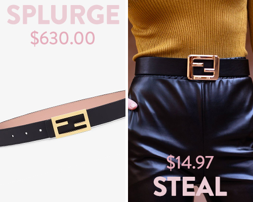 We love the huge gold buckle on this sleek black belt, which you’ll barely be able to tell apart from the Fendi version.