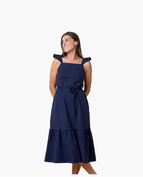 There is always room for at least one more dress in your closet! This fun and flattering midi-dress is a warm weather staple with its flutter sleeves, removable waist tie and ruffle flounce hem.