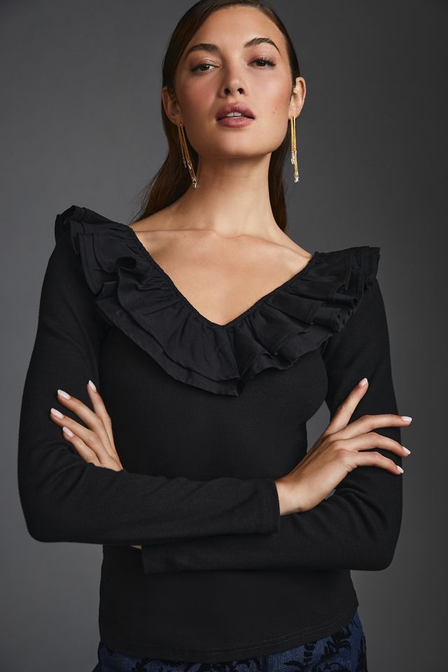 Keep it classy and refined with this black ruffled v-neck top that can easily be worn with any type of pant or skirt. Also available in a wine color, the ruffled detail of this top creates a beautiful neckline perfect for the addition of layered or dainty necklaces.