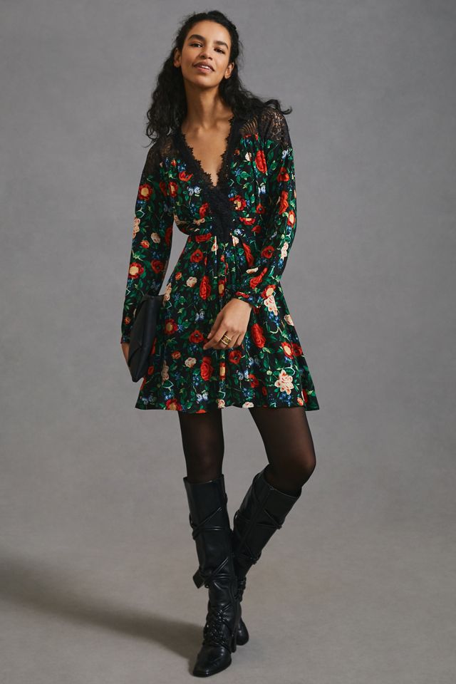 A new dress is always a great investment piece. This long-sleeved mini dress features black lace details that are paired with a feminine floral print that can be either dressed up or dressed down. Don’t forget to accessorize with a long necklace or dangly earrings.