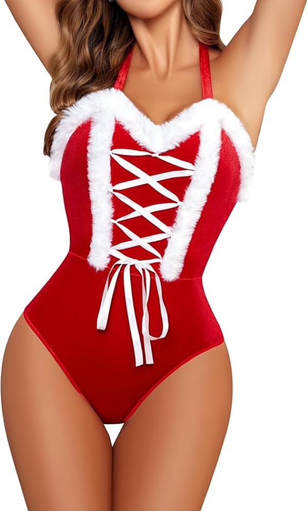 This Santa-themed mini dress might give you more coverage than your average lingerie, but it definitely doesn’t skimp on the sex appeal! The velvet material, fuzzy trim, halter neck, and cinched waist design will flaunt your every curve.