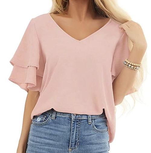 This top is available in 10 solid colors and 8 prints/patterns, including florals, tie dye, and animal print, so there’s something for everyone… and everyday. The sleeves are half sleeves or 3/4 sleeves, with layered ruffles that aren’t tight on the arms and create a stylish silhouette. Honestly, this is the kind of top you’ll want to wear all the time! Because it’s so flowy, it’s crazy comfy (and perfect for hiding that food baby you have after an amazing dinner).