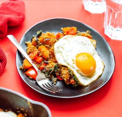 What You'll Need: sweet potato, red onion, garlic, red bell pepper, spinach, quinoa, vegetable broth, eggs, salt, pepper, red pepper flakes
