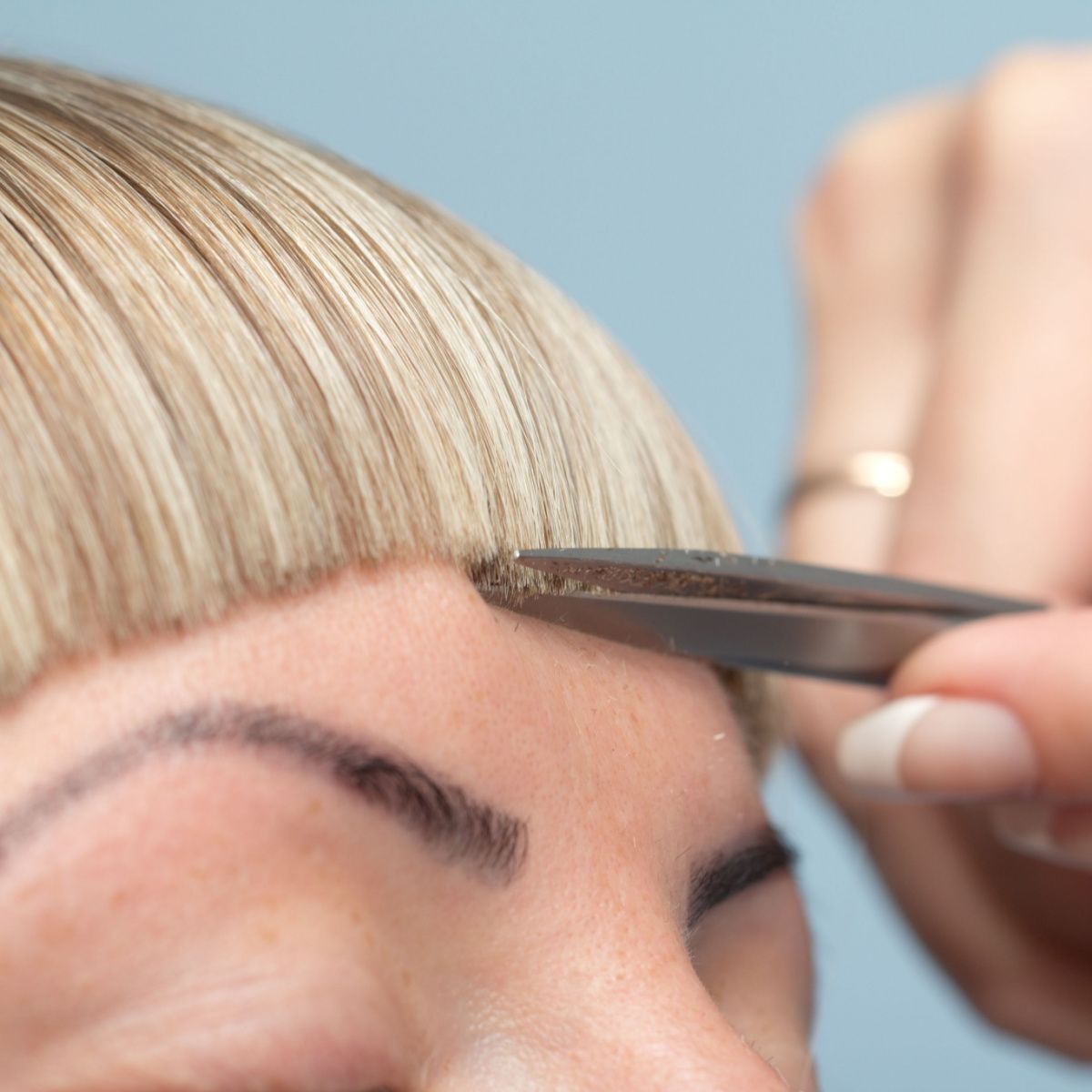 "You don't want short bangs that fall right in the middle of your forehead where you might have a few lines," Abdullah continues. Instead, she recommends cutting your bangs at your eyebrow level "to emphasize your eyes."