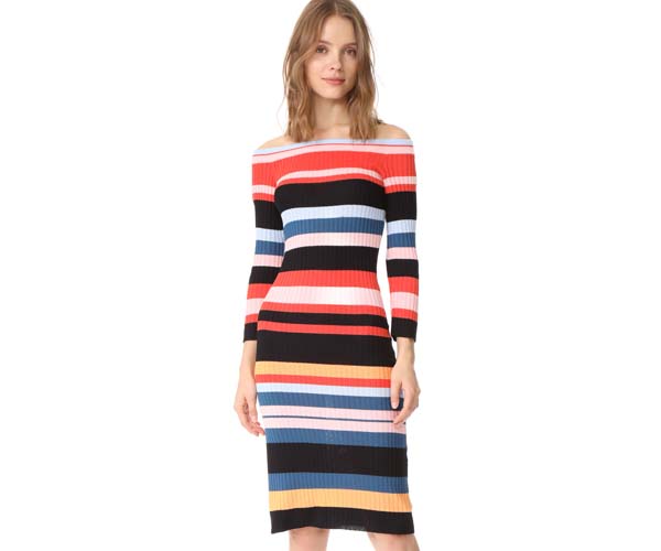 Channel the 80s because sweater dresses are here to stay. The casual meets professional dress is a great addition to your closet. It's comfortable, versatile, and flattering. This midi length, off-the-shoulder dress is fun but serious enough for work. We love the multicolor stripes!