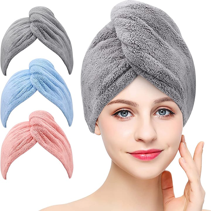 This hair towel pack contains three microfiber towels that can dry hair faster. These absorbent, anti-frizz towels come with buttons to securely clip back into place. And, they're great for drying all types of hair---curly, thin, thick, long, and short!