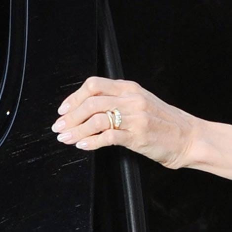 Her band is custom-designed by her longtime pal Jennifer Meyer and features a row of diamonds inset among rounded, yellow-gold bands. [Photo: Splash News]