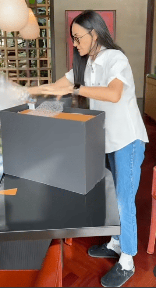 In an Instagram Reel, Demi Moore opted for black buckled clogs, styling them with a white short-sleeve button-down and cropped straight-leg jeans.