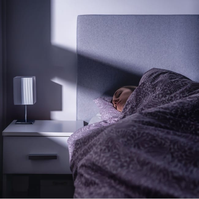 Dr. Anna Gyarmathy tells us to keep the temperature around 65°F, a comfortable level for most people, and "darken the room or use eye covers. Turn on some white noise (machine, phone, fan) or use earplugs. This promotes good quality sleep."