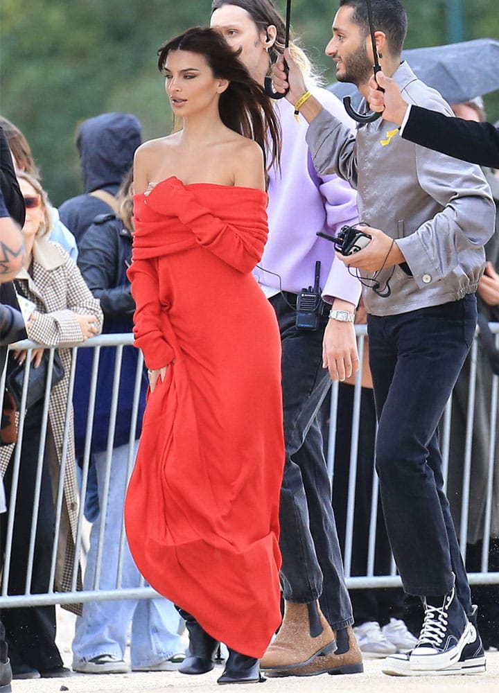 Emily Ratajkowski was a vision in red as she graced the Loewe Spring 2024 presentation for Paris Fashion Week! The supermodel, 32, turned heads in a bold and beautiful fiery red gown from the famed Spanish label.