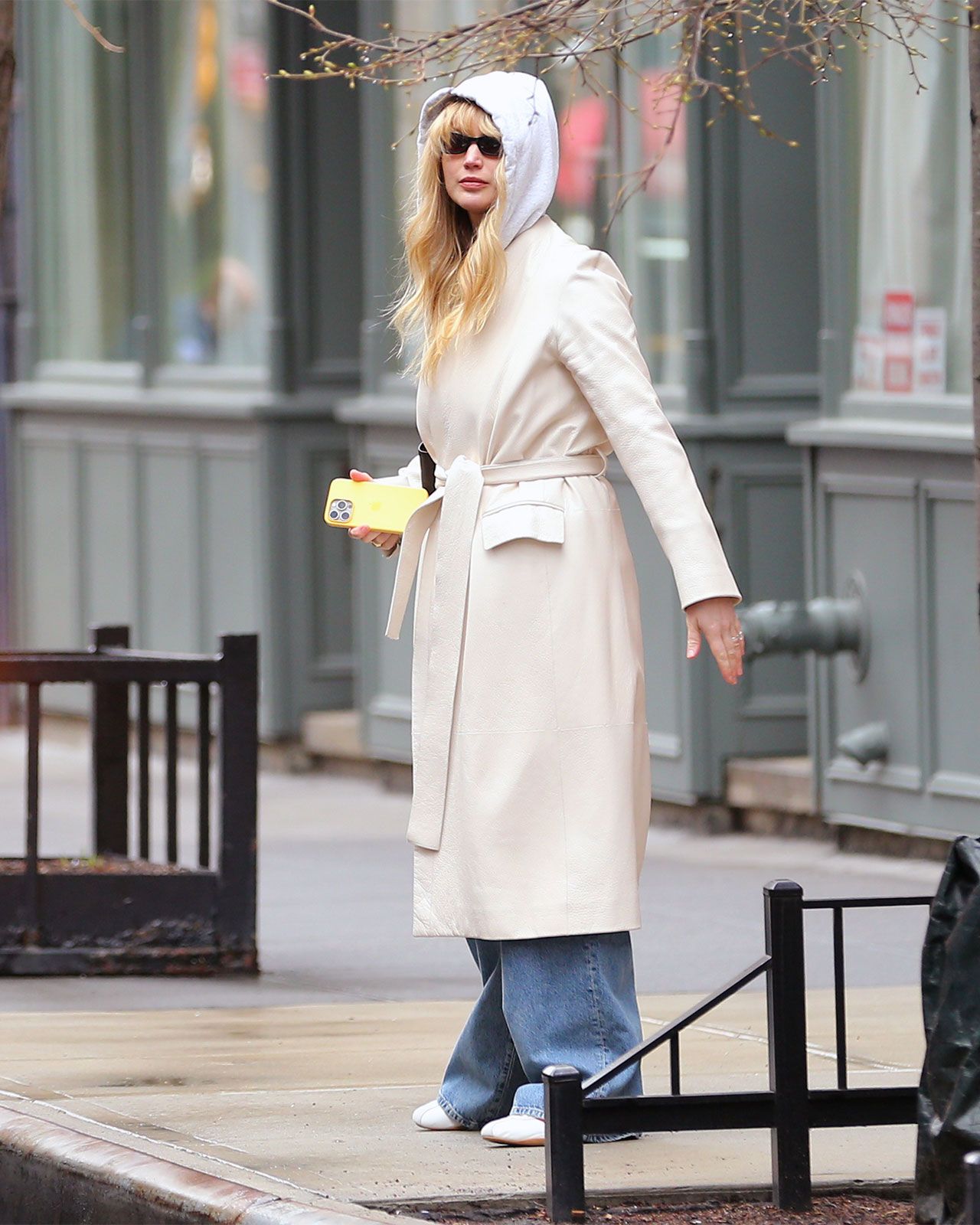 True to her status as the queen of quiet luxury, the Hunger Games icon wore a relaxed beige thigh-length sweater paired with a taupe satin midi skirt. She completed the look with classic black T-strap ballet flats, striking the perfect balance between comfort and chic. See the photos here!