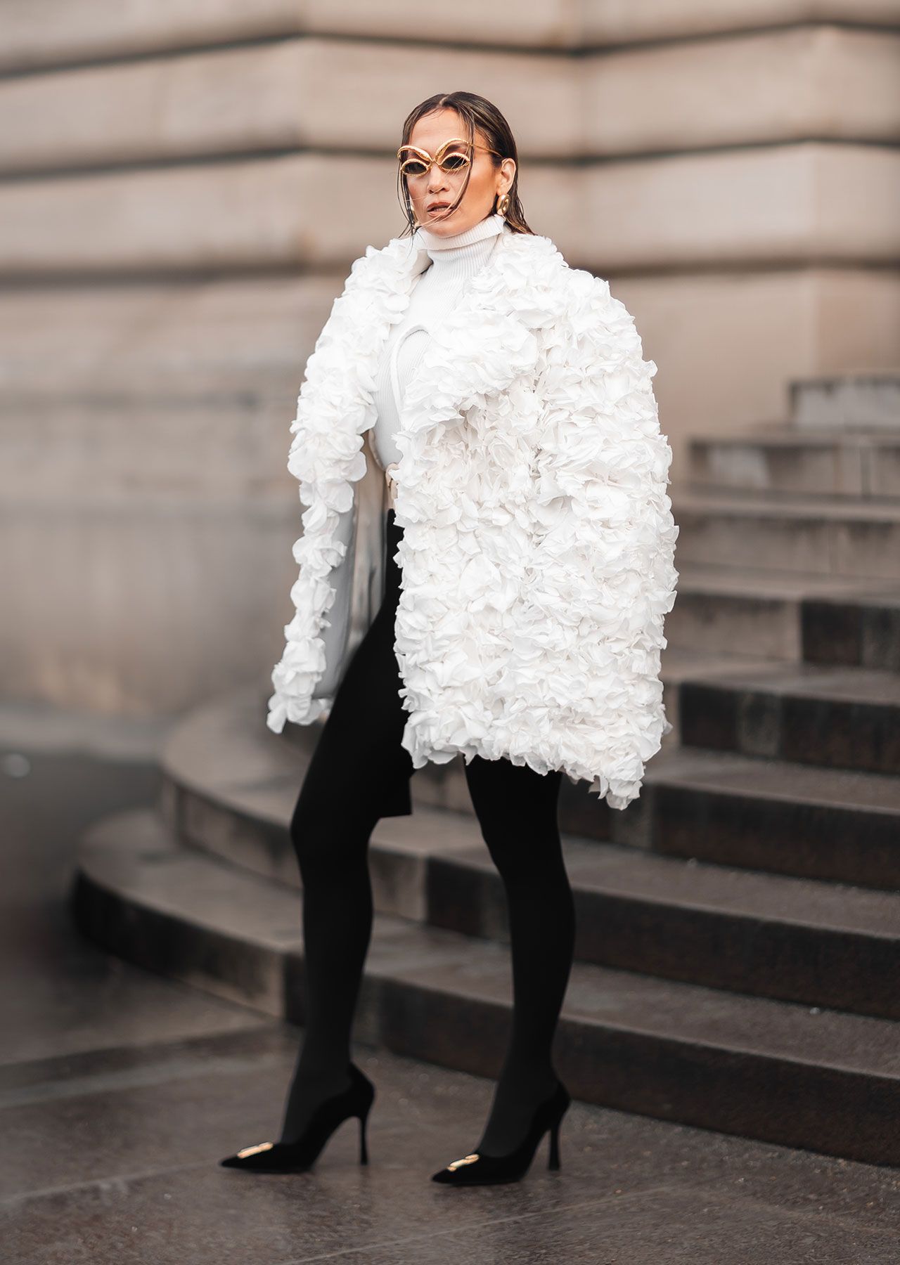 The Shotgun Wedding star, 54, debuted a new bob haircut and rocked a stunning custom look consisting of a white turtleneck sweater adorned with sculptural details, black high-waisted leggings, and a jacket crafted entirely out of real white rose petals.