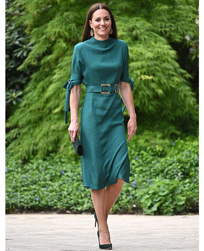 The mom-of-three accessorized her dreamy ensemble with matching green heels, an Emmy London clutch, and Nadia Irena statement gold earrings, which complemented the buckle detailing of the dress's belt. Her makeup was minimal yet flawless, as always, and her brunette locks were worn in a sleek and straight style, and were pushed to the back so as not to take anything away from the dress. Another expertly thought out look from the Duchess who never puts a sartorial foot wrong! What will she wow us with next, we wonder?!