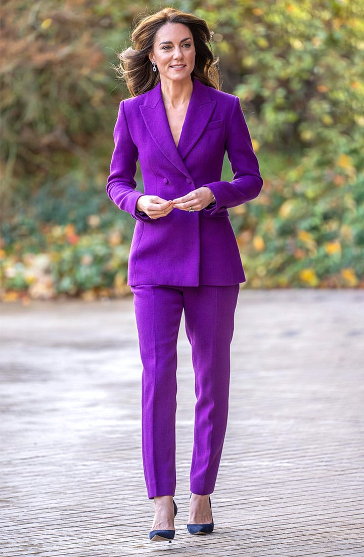 Kate Middleton expertly blends cherished royal heirlooms into her chic ensembles, often donning pieces once owned by the late Queen Elizabeth II and Princess Diana. For a recent appearance in London, Princess Kate donned an eye-catching, radiant violet pantsuit from Emilia Wickstead along with diamond-and-sapphire drop earrings previously owned by Lady Di.