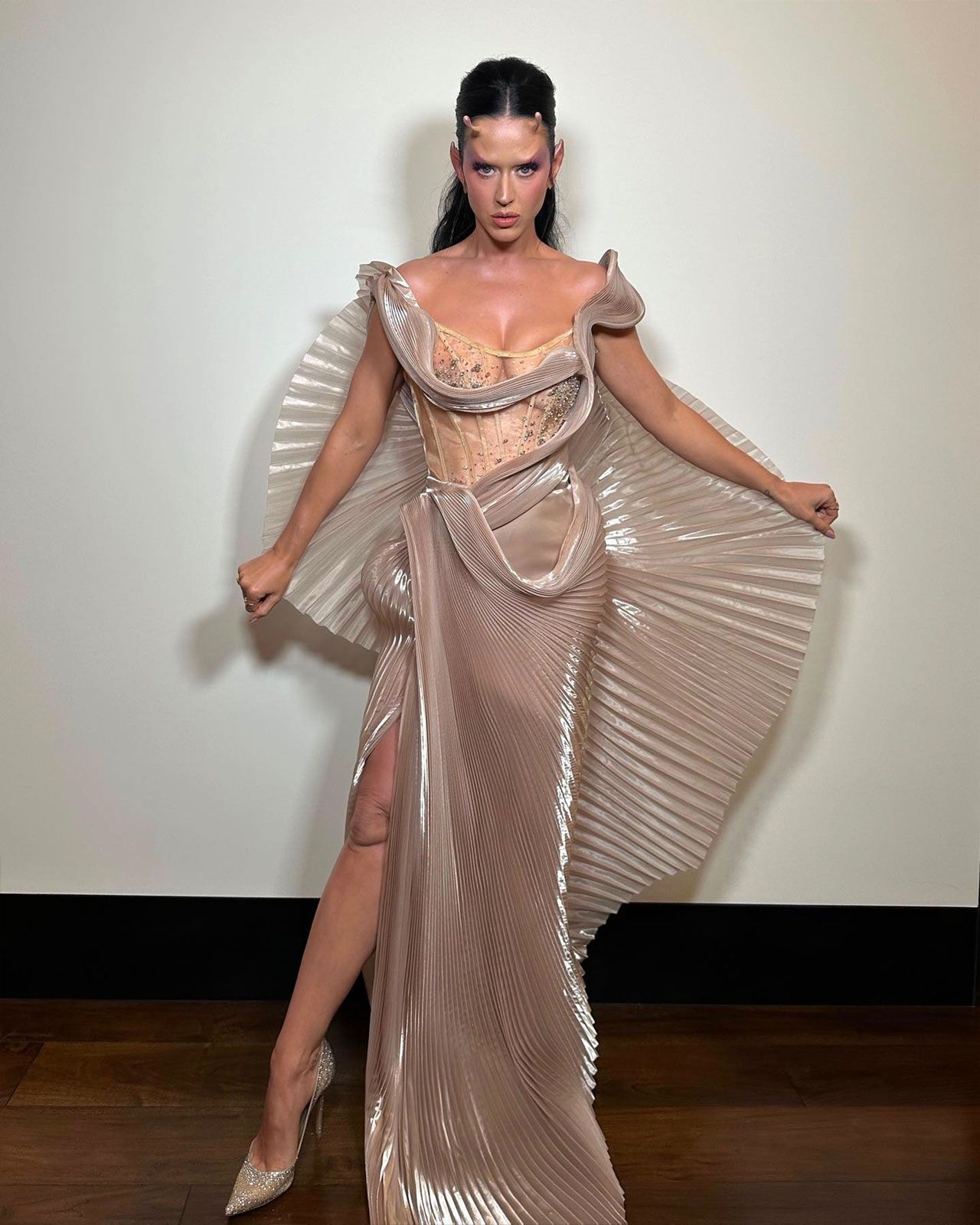 Perry’s stunning ensemble was captured in her January 21st Instagram post, which garnered the attention of her 206 million followers. Dressed in a shiny Maison Met dress that featured a corseted, low-cut bodice, the “Dark Horse” hitmaker looked every bit like an iridescent being from another planet thanks to her jaw-dropping prosthetics.