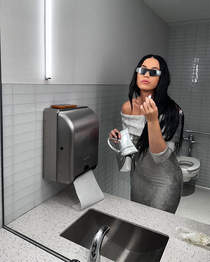 In a bathroom mirror selfie, Perry exuded glamour and sophistication in her silver dress, effortlessly pairing it with chic shades that complemented her outfit flawlessly. The style icon also carried a matching purse and wore her signature raven tresses down, parted in the center and styled into effortless loose waves.