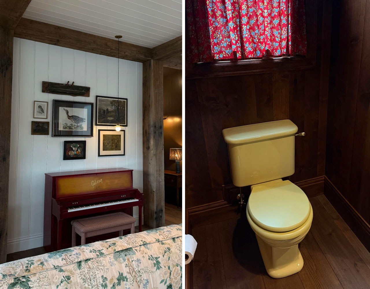 Another room showcased in Kendall’s pictures is what appears to be her antique-inspired living room with a very unique couch. She brought in a small Gibson piano, which sits up against a wall covered in old-timey-looking prints and photographs, including one of a duck and another of a small owl.