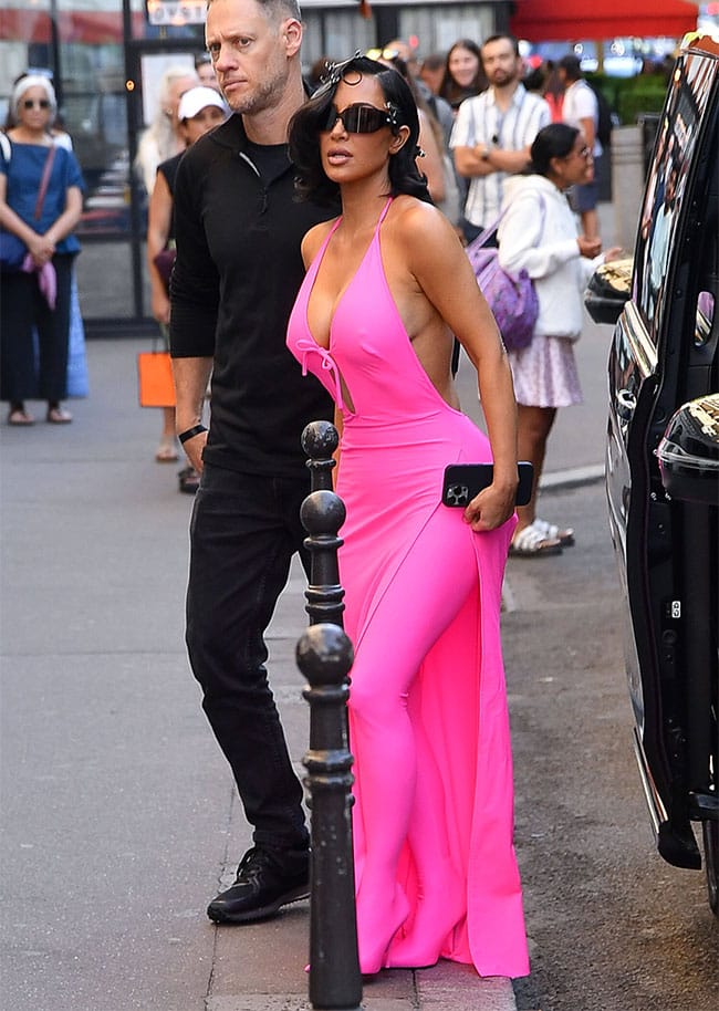 On Tuesday, the reality star—who was recently in Venice for Jeff Bezos and Lauren Sanchez’s wedding—stepped out in Paris for a Balenciaga fitting wearing a striking neon pink ensemble by the fashion house. The eye-catching look included a hot pink gown with a halter neckline, a bow detail at the chest, and a dramatic backless silhouette.