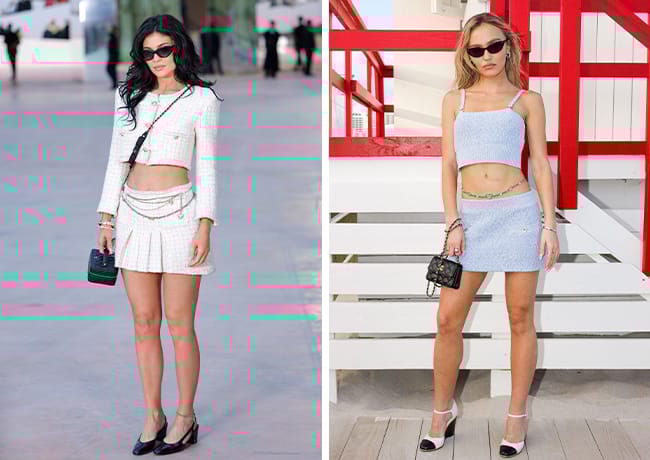 For the first notable comparison, at the Chanel Cruise 2022/23 show in Miami at Faena Beach, the Nosferatu actress wore a powder blue Chanel two-piece set featuring a matching crop top and skirt. The ensemble was accented with a belly chain belt, perfectly complementing the beachside runway theme. The show took place on November 4, 2022, a year before Jenner began dating Chalamet.