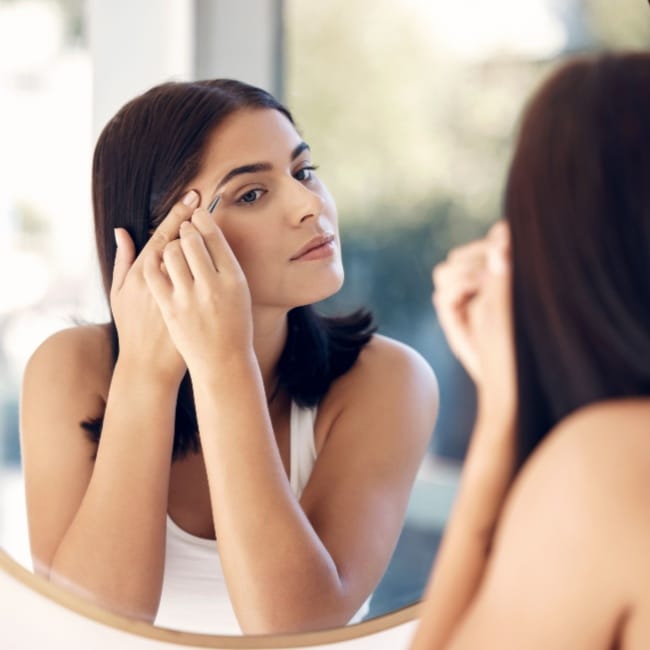 She recommends choosing a brow shade slightly lighter than your natural color for a softer effect. Overly sharp or skinny brows can also age you, while fuller, feathered brows lend a more youthful appearance. “A fat brow lends to a more youthful look because if you look at most children, 99% of them have glorious fat brows that have not been touched,” she adds.