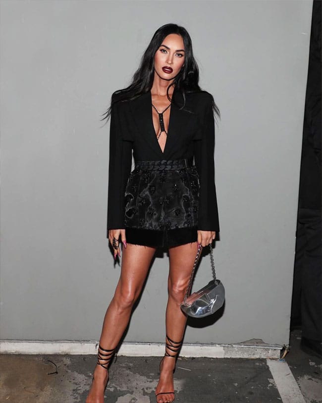 The 35-year-old beauty flashed major leg and looked absolutely flawless in this plunging (and pantless) black blazer look. And Megan perfectly accessorized with a sexy body chain, lace-up stilettos, and dark glam makeup.