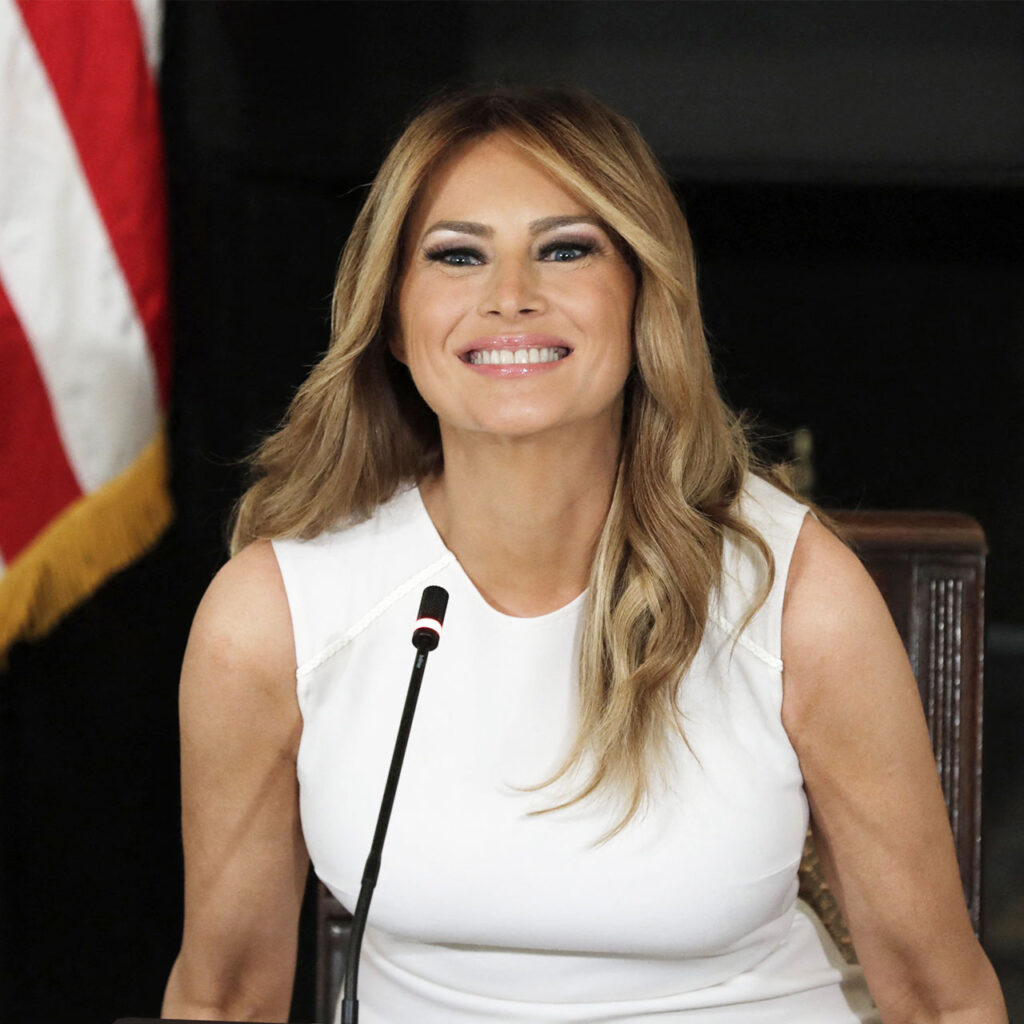 As for her glam, Melania wore her caramel-colored tresses in a face-framing updo. For her makeup look, she opted for smokey gray eyeshadow, black liner, voluminous lashes, rosy blush and a glossy pink pout.