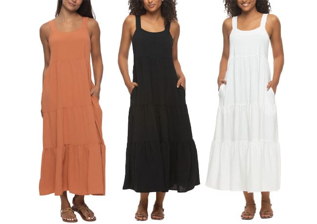 Another summer wardrobe staple is a light, comfortable maxi dress. When the weather is too hot for you to care about what you're wearing, you can throw on a maxi dress without worrying about the rest of your outfit. Costco is selling a super cute tiered maxi dress for only $14.99, and you can get it in copper, black, or white.