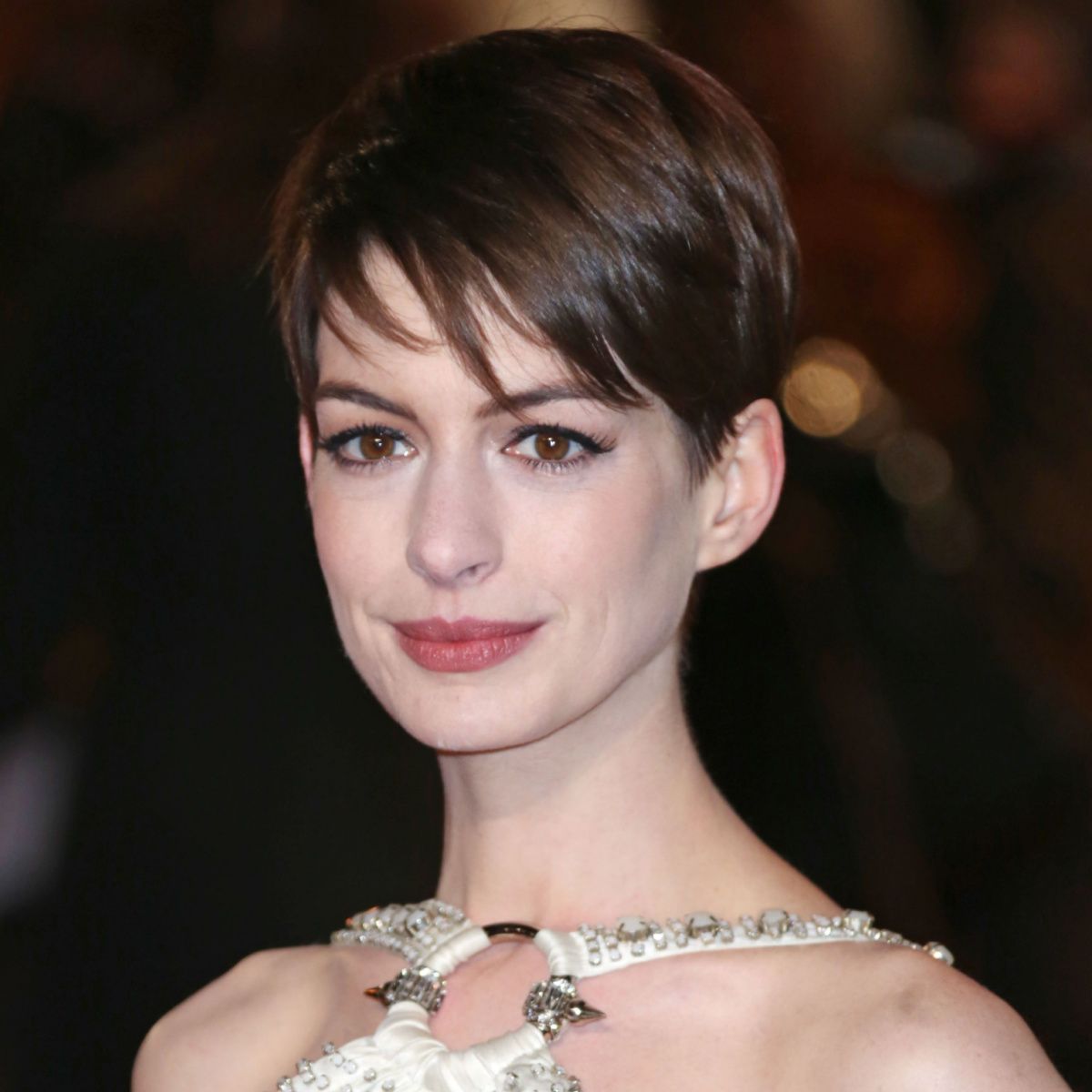 Another flattering touch to a great pixie is wispy bangs, Abdullah says. This cut, which requires face-framing, longer fringe parted down the center, "flatters just about any face at any age," according to Abdullah. These bangs, as seen on Anne Hathaway, she explains, "neatly frame the face while drawing attention away from serious aging signs."