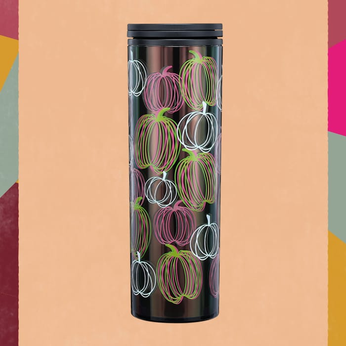Enjoy your hot (or cold) coffee this autumn in a neon and eye-catching, pumpkin-printed tumbler! This one is available at Starbucks for $19.95 and is one of the most noticeable on this list.
