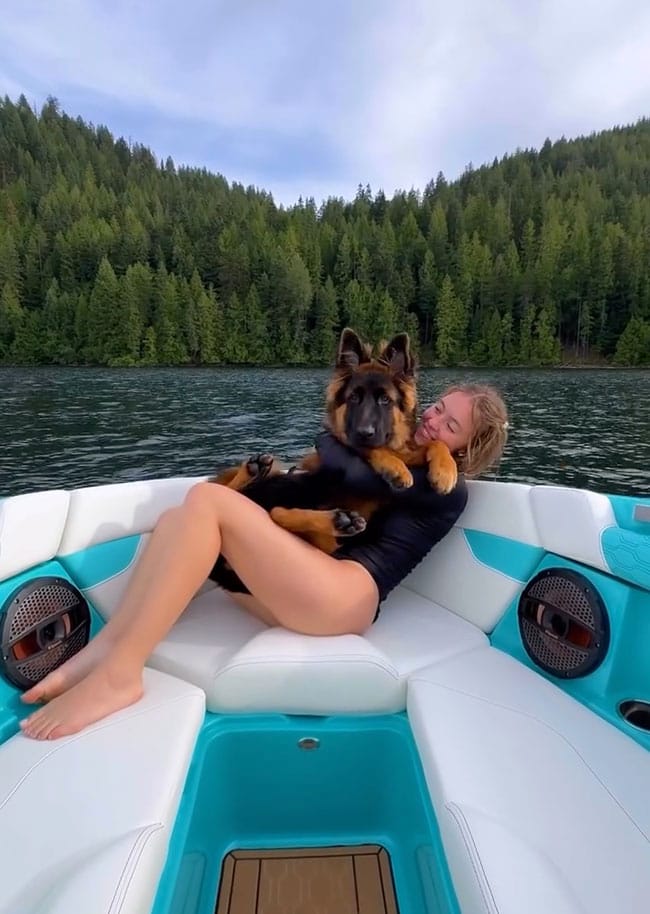 The film actress recently shared a brief video of herself and her German Shepherd puppy, Sully, lounging on a boat that seemed to be floating on a picturesque lake, treating herself to a little vacation. In her Instagram clip, Sydney sported a high-cut, sleek wetsuit, which allowed her to show off her long legs. Fans were in awe of not only how great she looked, but how nice her lakeside vacation seemed as well. Read more about her little vacation clip below.