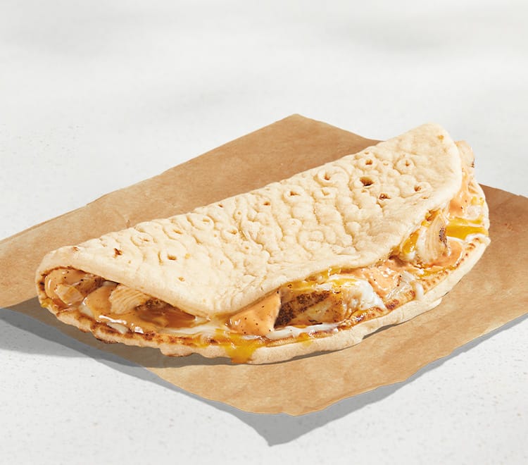 As described on Taco Bell's official website, the 3 Cheese Chicken Flatbread Melt features a tender flatbread stuffed with grilled, marinated, all-white meat chicken, drizzled with Creamy Chipotle sauce, and topped with a blend of three melted cheeses.