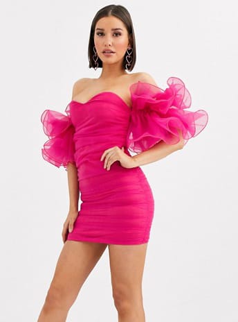 Club L London Extreme Ruffle Sleeve Ruched Mini Bardot Dress In Fuschia ($103)