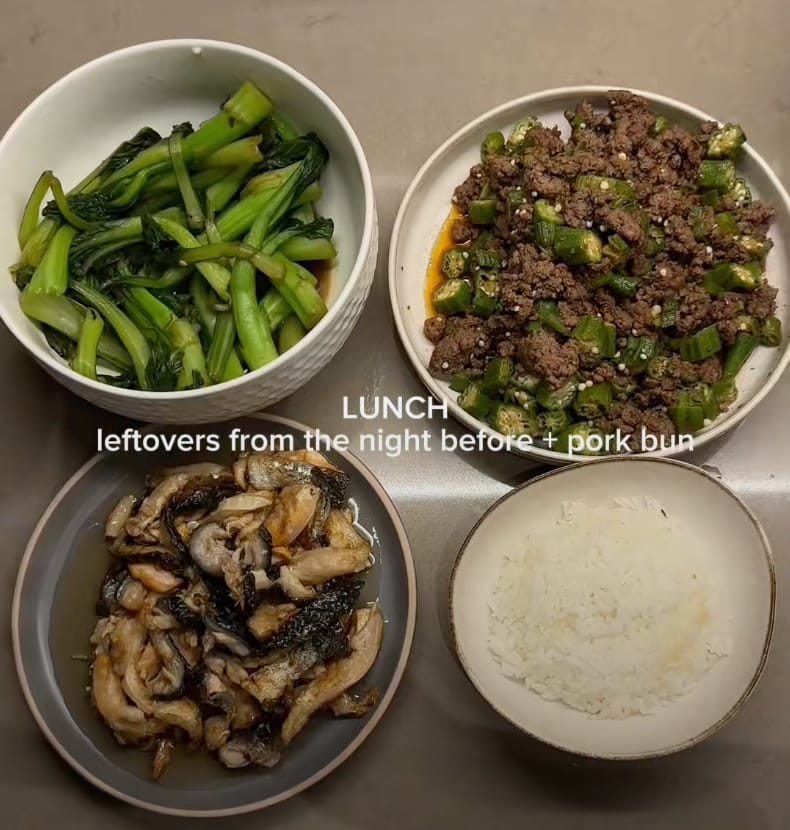 For lunch, she went with some leftovers and pork buns. These included rice, okra with meat of your choice, and greens such as bok choy.