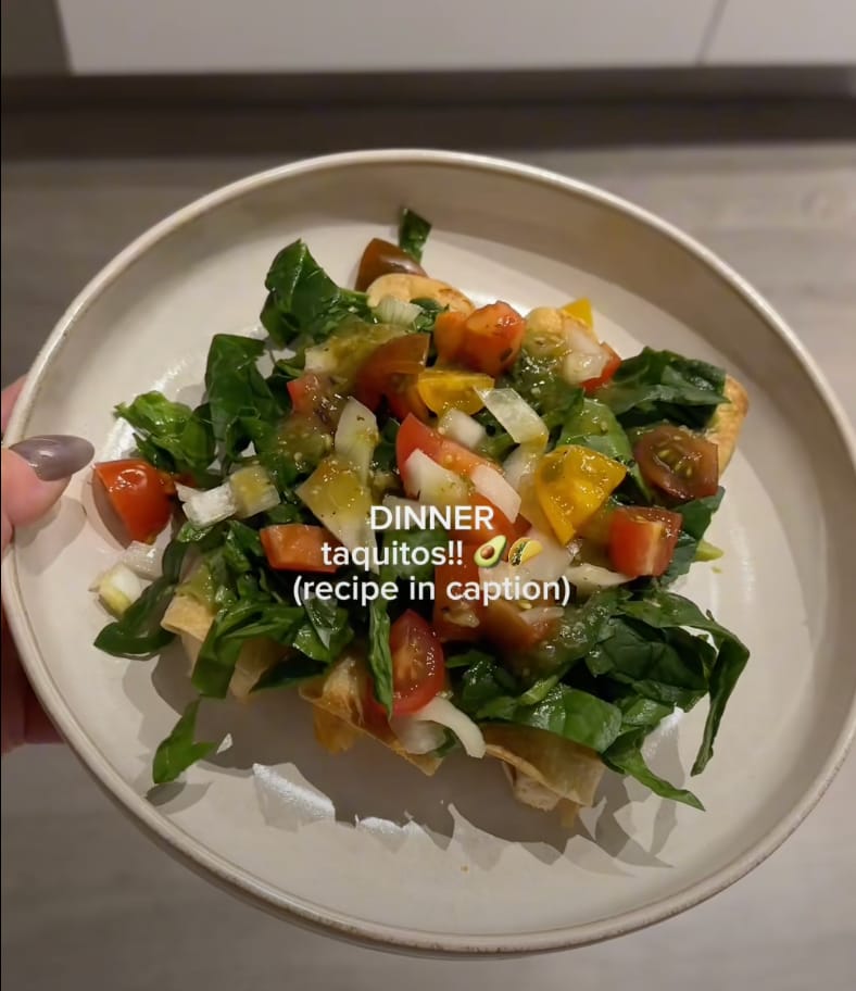 Here’s her favorite recipe and how she makes it: Add shredded chicken (she uses rotisserie) and cheese of your choice on corn tortillas and roll it up. Spray oil, then bake in @ourplace wonder oven for 15 mins at 425F. Add toppings of your choice! She loves guacamole, shredded greens, tomato, onion, and LOTS of salsa.