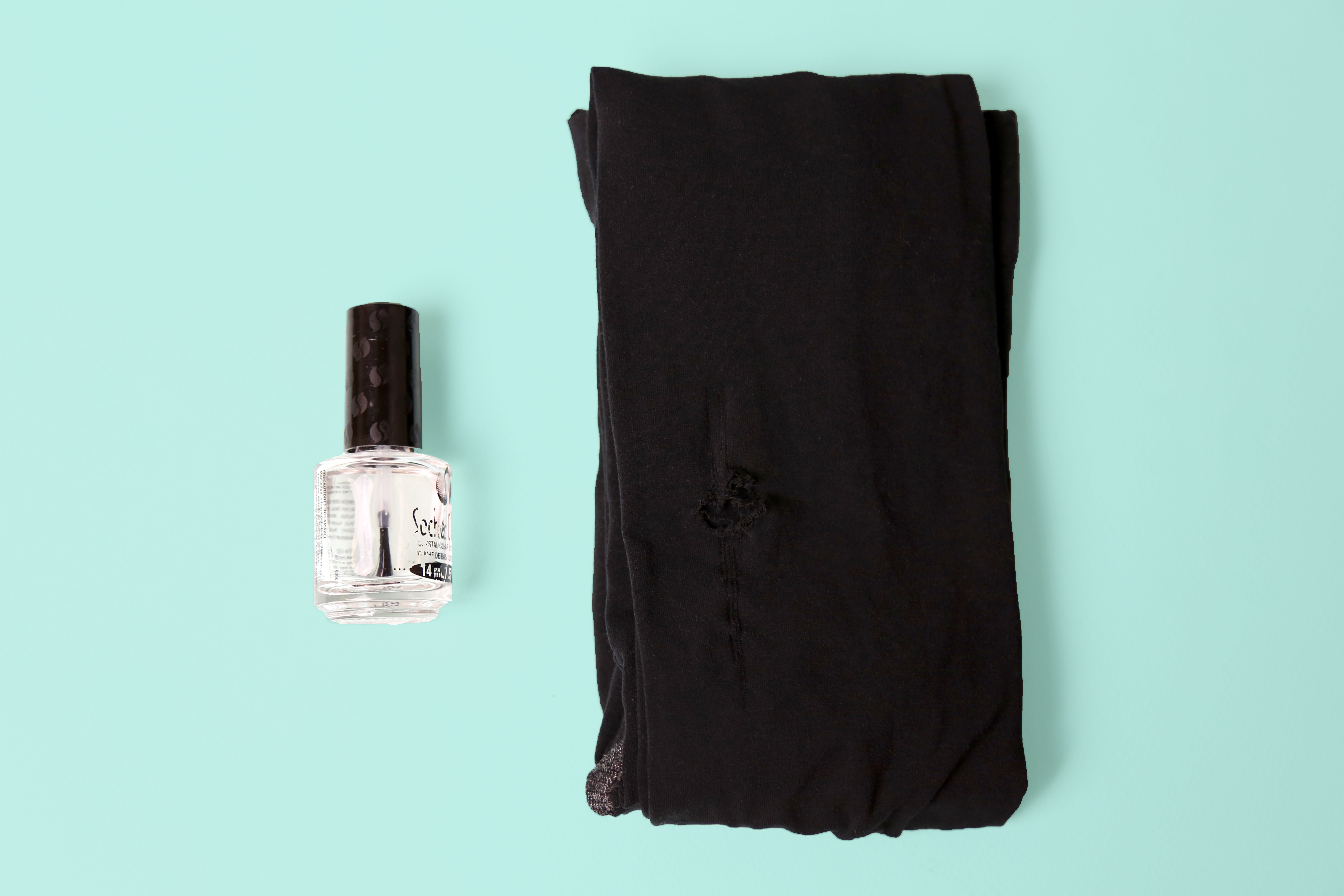 1) First, get the pair of tights with the run in them and a bottle of clear nail polish.