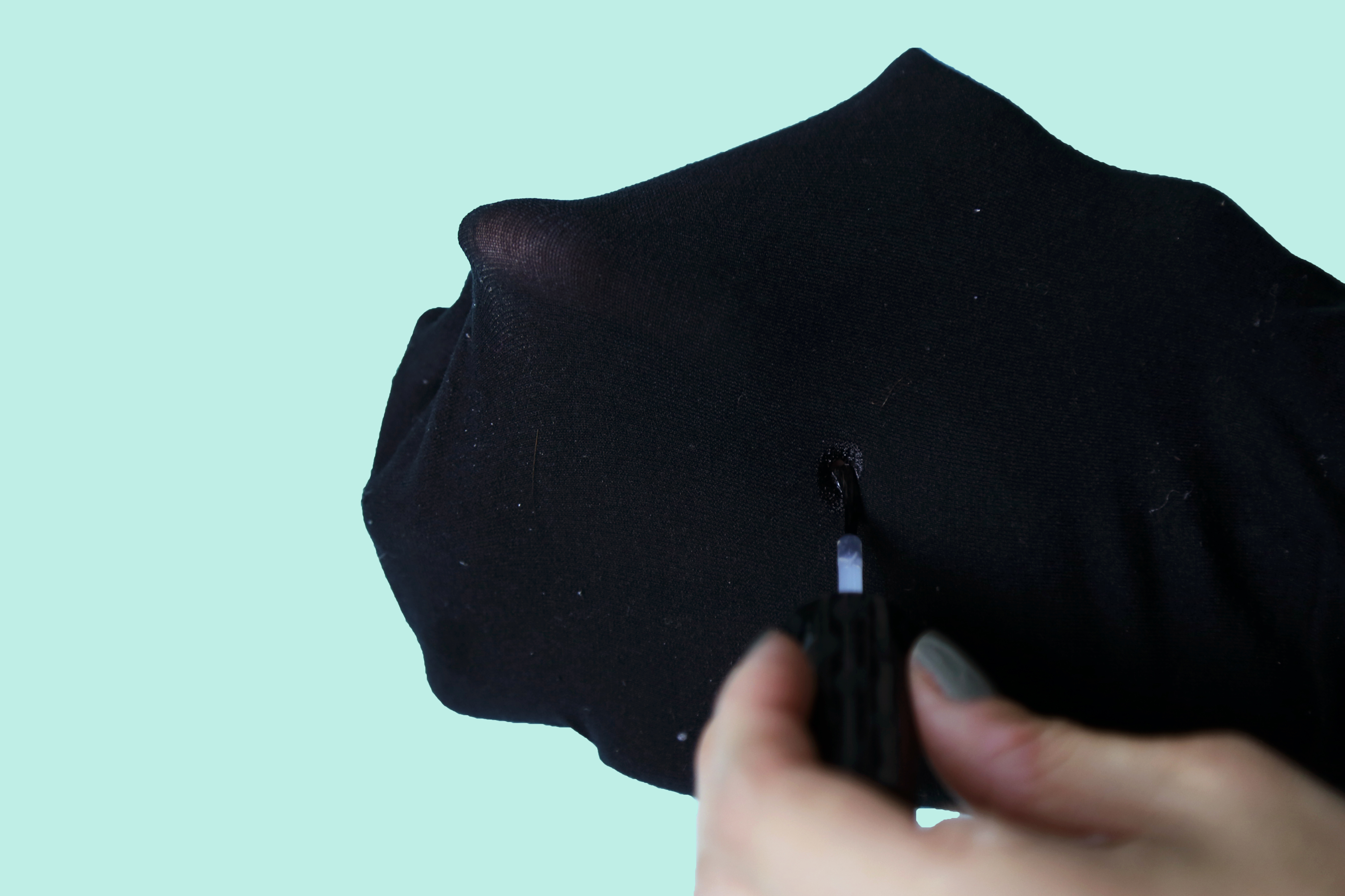 3) Apply the clear nail polish over the run. Then take your arm out of the leg hole and pinch the hole shut. Leave the nail polish to dry, and in a few minutes, your tights should be good as new!
