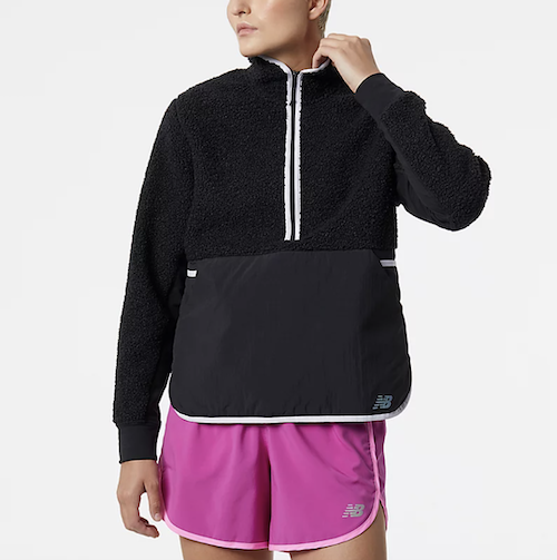 Add this New Balance sherpa pullover on your list. Available in black and grey, this pullover is a lightweight anorak with sherpa at the top and a water-resistant fabric at the bottom—warmth without unnecessary weight. The front kangaroo pocket offers serious storage for hikes, runs, or a quick errand trip. Contrast zipper and stitching makes this pullover an eye-catching fashion piece that is insanely comfortable. Yes, please!