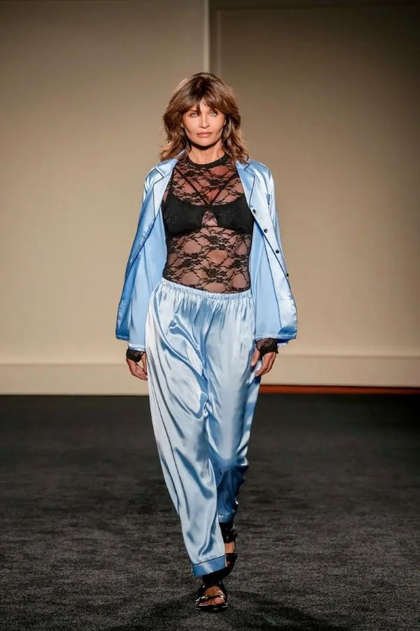 The acclaimed supermodel and fashion icon opened the show, wearing a piece from the brand’s “Pure Comfort, Soft Elegance” collection. Specifically, she flaunted a blue silk pajama set and looked like a total smoke show. Yes, she’s wearing lingerie underneath for effect, but I’m obsessed with how chic this set looks, all while being supremely soft and comfortable.