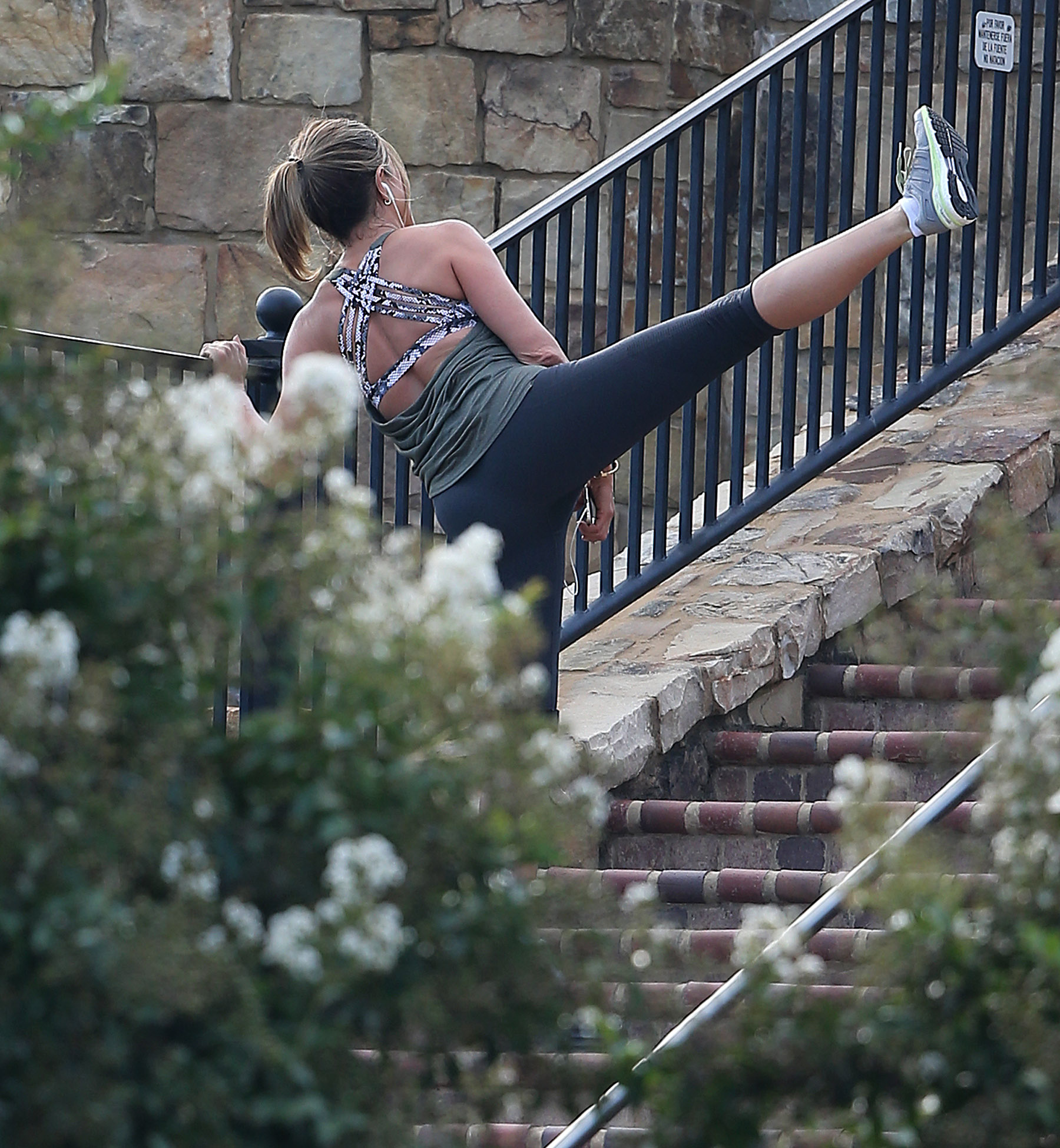 Jennifer Aniston was spotted working out on the set of her new movie Mother’s Day wearing a complete Lululemon ensemble. Her slate gray top has a draped, open back (pictured below) that shows off the snakeskin-print strappy bra, which is attached to the top. She also wore a pair of classic cropped leggings. Shop her entire outfit below!