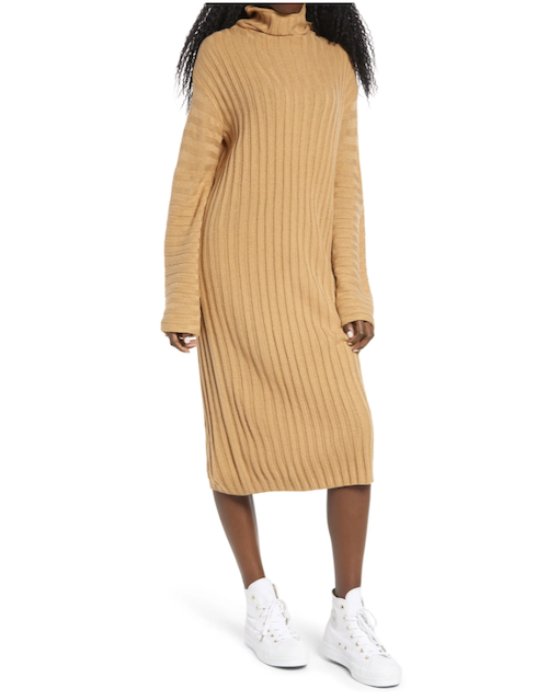 Right now, this tan midi sweater dress is on sale for only $33, which is too good to pass up. With a turtleneck and long sleeves, staying warm will be the least of your worries. This dress is so easy to wear, too. I mean, it can go with anything: sneakers or boots or heels, a longline coat or a shearling jacket or a puffer, a beanie or a flat-brimmed hat or a beret. A sweater dress like this one is perfect for this holiday season–you can look dressed up for your family dinner, even though you’ll feel like you’re cuddled up in a blanket.