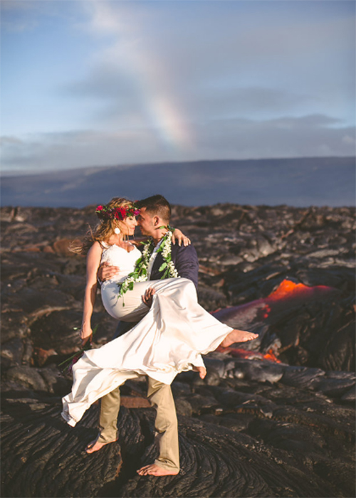 Lauren and Alex Michaels shot their photos on a–wait for it–LIVE volcano. Yes, you read that correctly; the couple went to *great lengths* along with their wedding photographer Jenna Lee to take memorable pix on the Kilauea volcano: